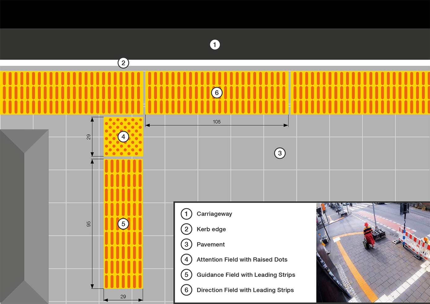NavTac tactile guidance system infographic – Floor films for barrier-free orientation, safe and durable. (1. Roadway 2. Curb 3. Sidewalk 4. Attention field with studs 5. Guidance field with guide strips 6. Direction field with guide strips)