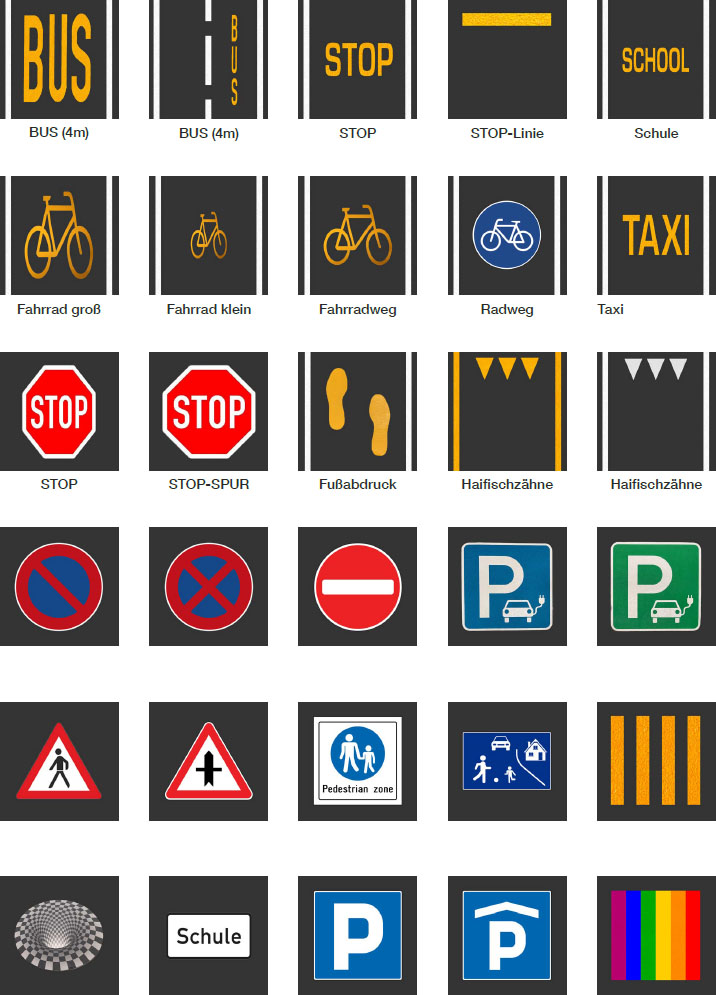 Marquages routiers temporaires : flèches, symboles de bus et de vélos, ainsi que d'autres motifs. Faciles et rapides à poser, ils offrent une grande visibilité de jour et une bonne réflexion dans l'obscurité. Les symboles de bus se composent de trois lettres et peuvent être apposés horizontalement ou verticalement. Faciles à retirer, ils contribuent à la sécurité routière et favorisent une gestion claire du trafic.
